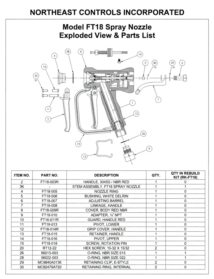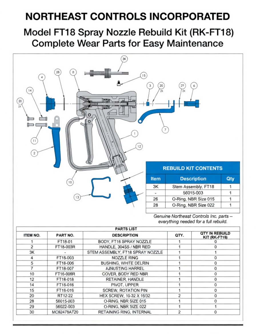 With proper care, your Model FT18 Spray Nozzle will provide years of reliable service. Inspect parts regularly and replace them as needed with genuine Northeast Controls Inc. parts.